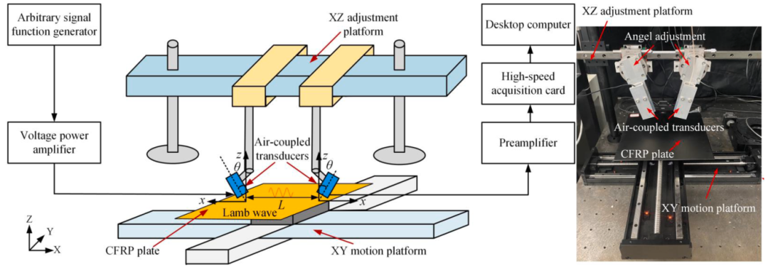 任意信号函数发生器产生汉宁窗调制中心频率为200kHz的正弦脉冲信号。随后采用电压功率放大器将激励信号电压提高到400Vpp,以确保空气耦合换能器激发足够的声学能量。由XZ调节平台调节两个空气耦合超声换能器之间的水平距离以及空气耦合超声传感器和CFRP板之间的垂直距离。