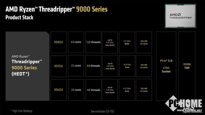 而面向HEDT平台的Threadripper 9000系列处理器则包含9980X、9970X和9960X三个型号,分别拥有64、32和24核,最高主频5.4GHz,L3缓存方面,9980X拥有256MB,而另外两款只有128MB。