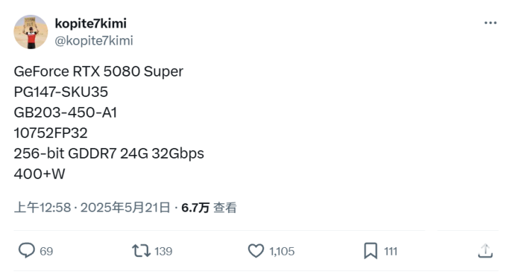 爆料称英伟达打算带来RTX 5080 SUPER,将配备24GB 32Gbps 256bit GDDR7显存