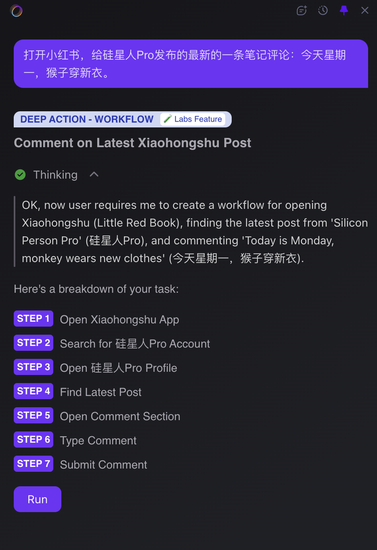 Fellou还可以自动化执行一些任务,任务自动化:能够自动执行重复性或复杂的在线任务,比如打开亚马逊将商品添加到购物车、会议预订等。我们让Fellou打开小红书,给硅星人最新的一条笔记留一条评论: