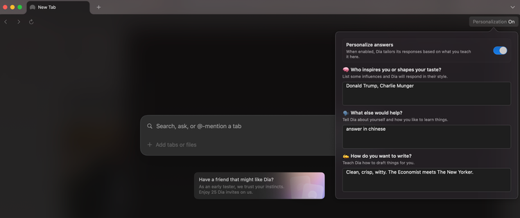 Personalization功能可以优化的预设Prompt,可设置你的语言偏好、表达风格,AI会智能调整以匹配。但实际上无论你如何尝试个性化Dia,它给人的感觉依然像是ChatGPT。