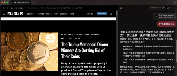 Josh Miller称之为极致上下文建构(tripling-down on context),这也是它试图区别于其他 AI 产品(比如 ChatGPT、Copilot、Perplexity)的关键。他认为AI 在浏览器里的关键不是模型多强,而是有没有完整的上下文能喂给它。