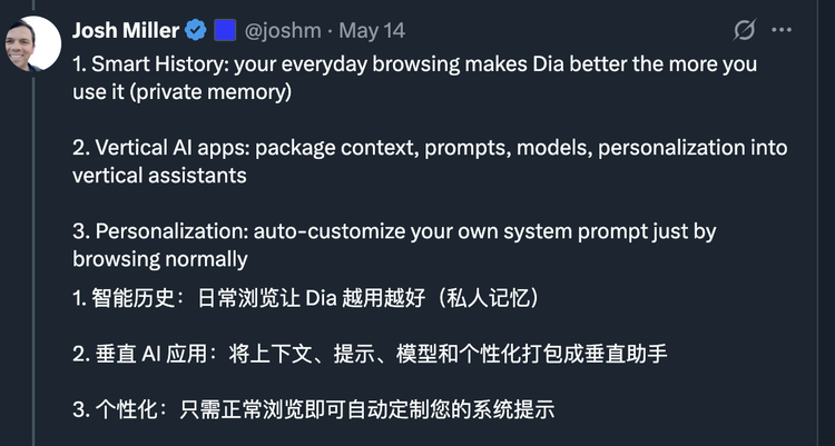 从Josh Miller透露的产品规划来看,Dia想做的是一个会成长的AI交互层,它学习你的习惯、自动适配你的任务。