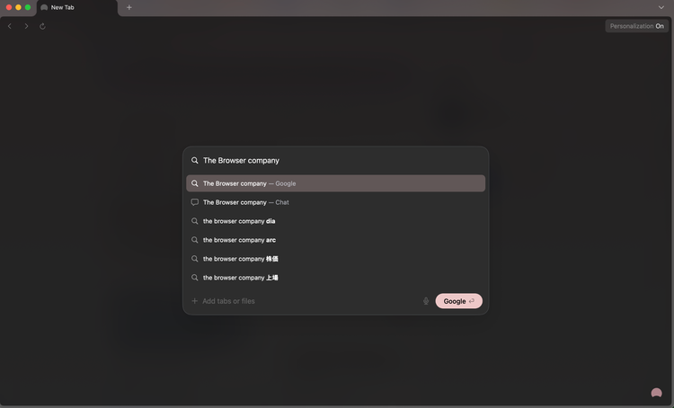 Dia浏览器并未采用 Arc 浏览器的纵向标签栏(Arc的核心创新之一)设计,而是重新使用了用户熟悉的横向标签页模式;首页设计极其简洁,只保留了一个输入框,提供 Google 搜索和 Chat 两个选项。
