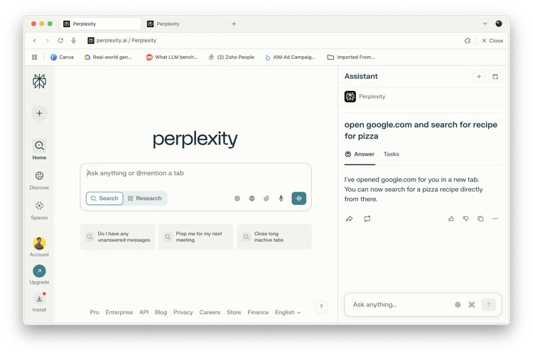 Comet会根据用户的浏览历史和打开的标签页(所有数据均本地存储,不用于模型训练)提供个性化响应。它还将Perplexity的核心搜索功能集成到侧边栏中,可在所有网站上访问,使用户无需切换标签页即可查询、总结或探索内容。