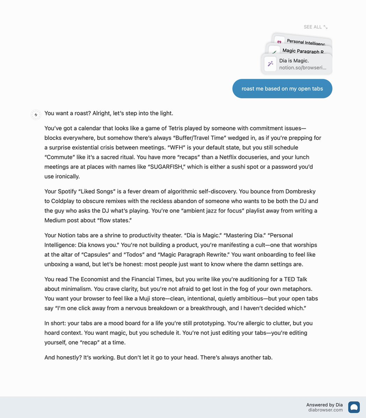 理想和现实之间总是有一些距离。Dia目前的早期版本,离他们第二支宣传片中那种能替你办事的AI似乎还有十万八千里,有人犀利地指出它在一些产品细节上有些亮点,但“本质上就是在 Chrome 上加了一层 ChatGPT 的外衣”。