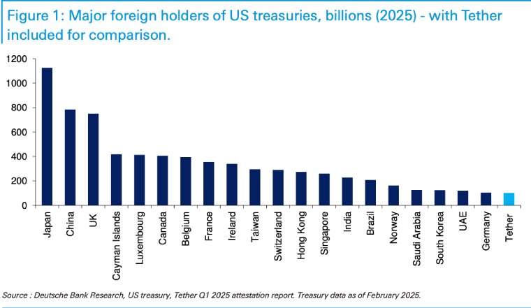 德银指出,目前,美元支持的稳定币在市场中占主导地位,超过 99% 的稳定币市值都与美元挂钩。这些稳定币持有超过 1,200 亿美元的美元支持资产,实际上充当了支持美国短期债务市场的货币市场基金的角色。例如,截至 2025 年 3 月,Tether 持有的美国国债已达到 985 亿美元,这一数字在 2020 年几乎为零,Tether 现已跻身美债主要海外持有者行列。