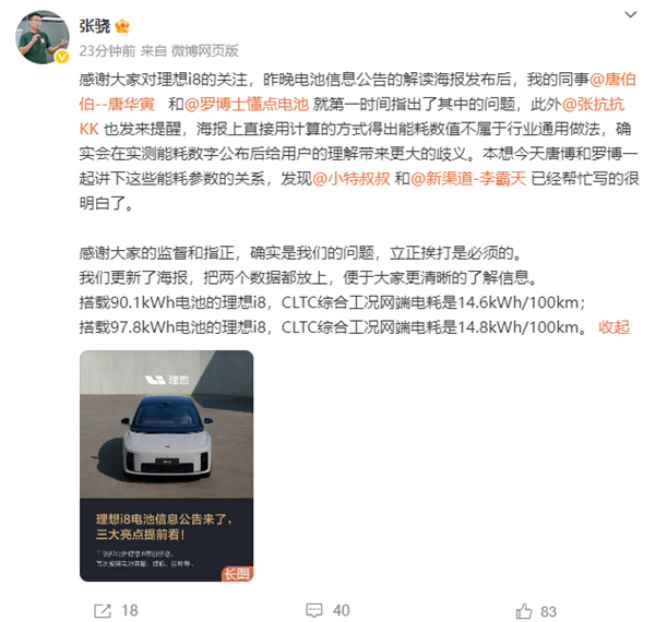 事情发酵后,理想汽车产品线负责人张骁刚刚正式就i8能耗进行了回应,在回应里,他表示: