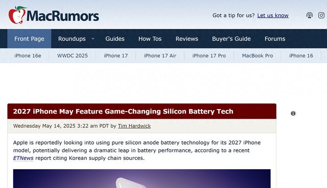 据海外科技媒体MacRumors报道,苹果公司即将推出的全新超薄机型iPhone 17 Air将首次采用先进电池技术。日本供应商TDK计划在6月底前发货新一代硅负极电池,该电池采用硅负极技术替代传统石墨材料,可使同等体积下的能量密度提升15%,这一突破对提升超薄机型的续航能力至关重要。TDK首席执行官Noboru Saito透露,工厂已加速生产进程,新型电池原计划第三季度出货,如今进度提前,这将助力厂商客户及时将电池应用于今年发布的超薄机型。