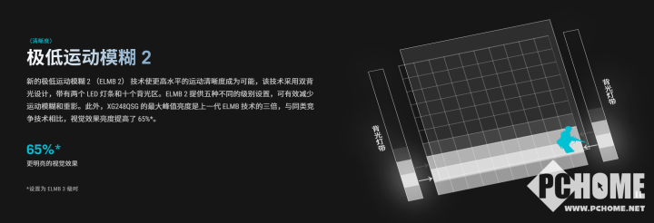 Strix Ace XG248QSG是首款搭载华硕升级版ELMB 2极低运动模糊技术的显示器。与以往的模糊抑制方法不同,ELMB 2采用双区域背光系统,拥有十个独立区域,从而在整个屏幕上提供更清晰的运动画面。这种设计解决了早期频闪技术的主要问题之一,即屏幕中心之外可能会出现模糊和伪影。启用ELMB 2后,亮度高达370尼特,与上一代解决方案相比,亮度显著提升,最高可达三倍。