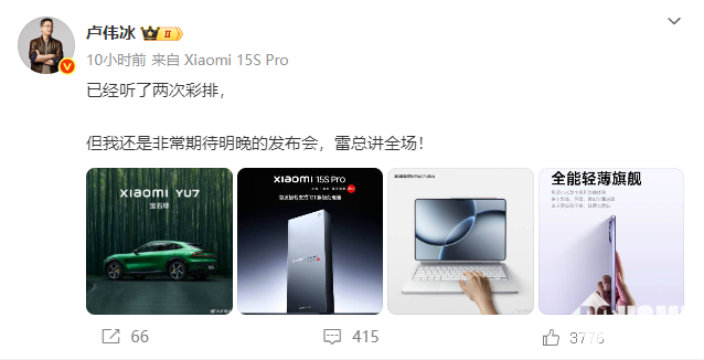据小米集团总裁卢伟冰透露:已经听了两次彩排,但我还是非常期待明晚的发布会,雷总讲全场。
