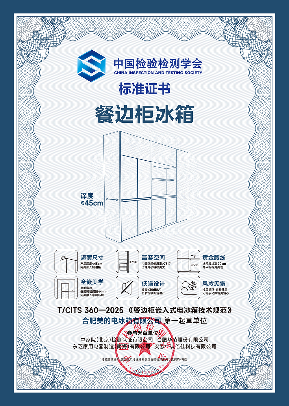 近日,中国检验检测学会发布通知,由合肥美的电冰箱有限公司牵头起草,中家院(北京)检测认证有限公司、安徽中认倍佳科技有限公司等多家权威机构共同参与制定的行业首个《餐边柜嵌入式电冰箱技术规范》团体标准(以下简称“标准”)正式发布。该标准的出台,不仅填补了餐边柜嵌入式电冰箱细分市场的标准空白,更为冰箱行业的规范化发展和品质提升树立新标杆。同时,作为冰箱行业创领者,美的冰箱近期上市全球首款餐边柜冰箱,开辟了餐厅场景细分新赛道。