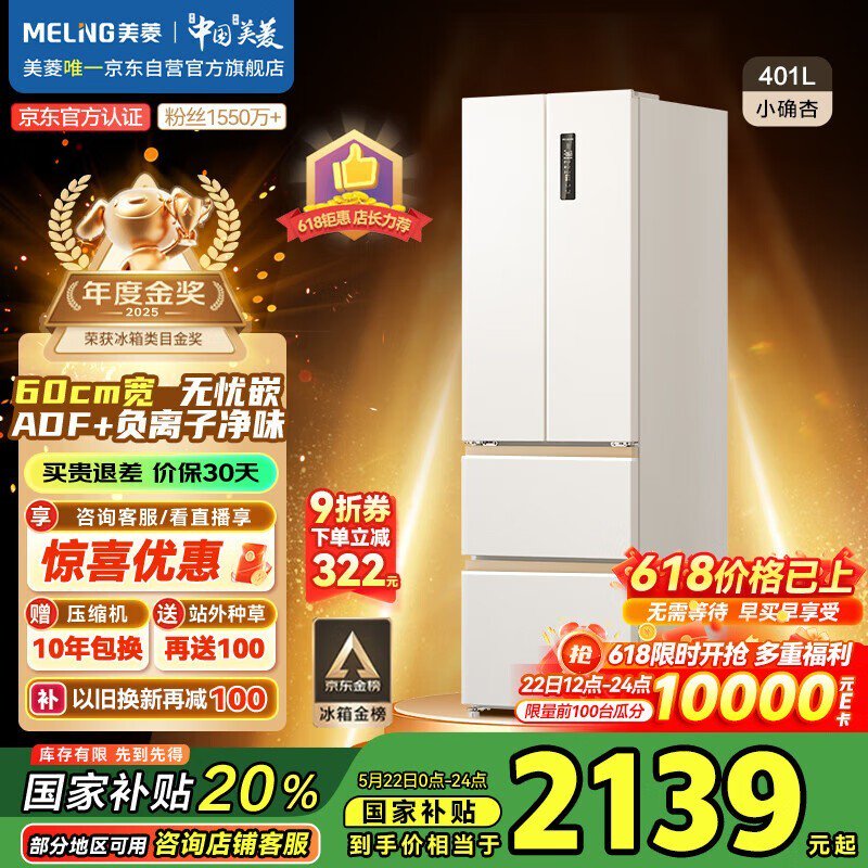 美菱小确杏401升冰箱 会员国补下单仅2308元