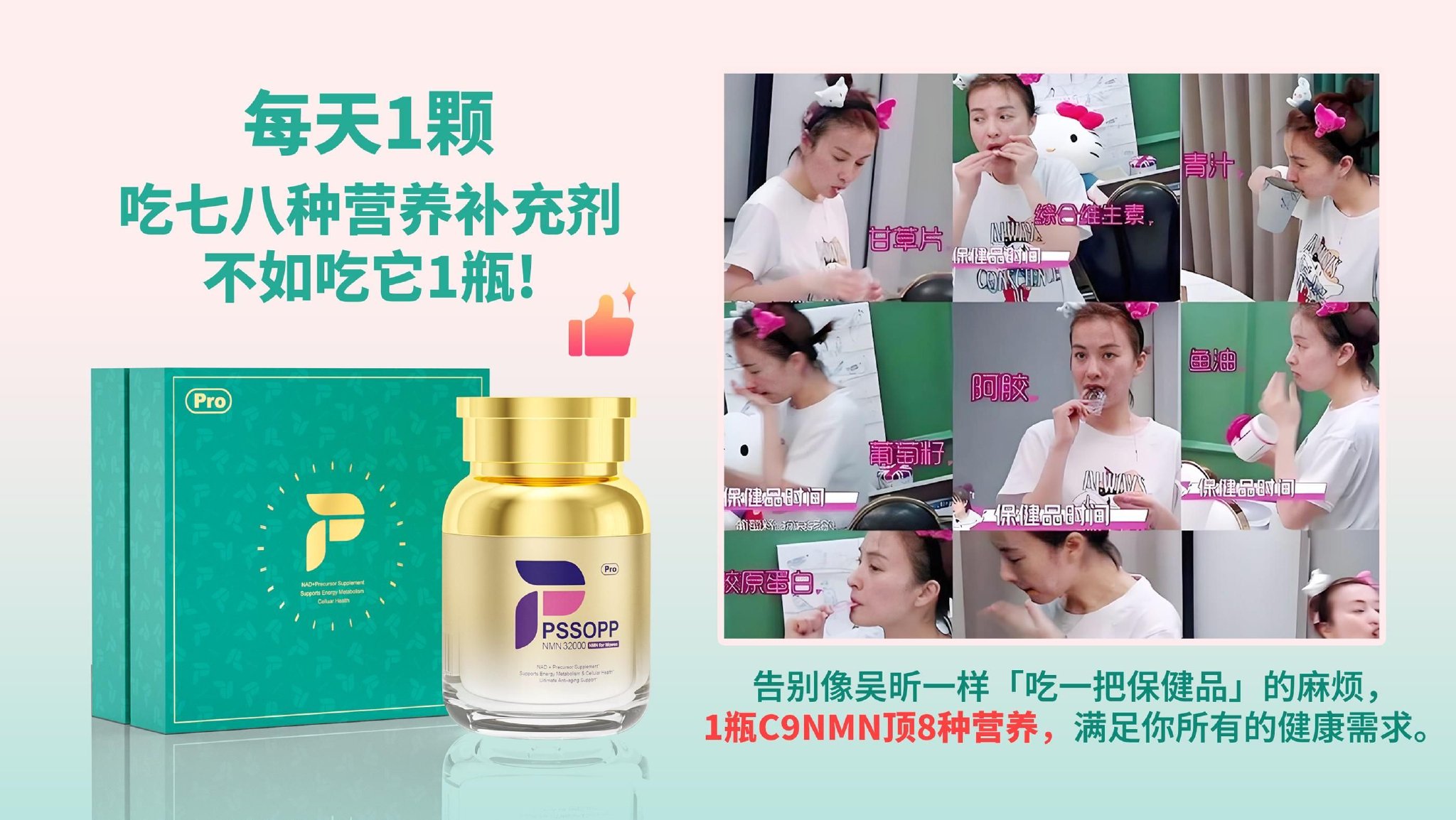盼生派(PSSOPP)采用高品质复合配方,科学融合市面上的优质成分,1瓶就涵盖了多种营养功效。吃七八种营养补充剂,不仅麻烦,还可能给身体和钱包带来双重负担。就像知名主持人吴昕在一档综艺节目中公开的那样,每天吃十几种营养补充剂,瓶瓶罐罐一大堆,不仅服用起来繁琐,还会导致肝脏受损,更别说普通人难以承受高昂的价格。而C9NMN盼生派一瓶就解决了这些问题,性价比极高。