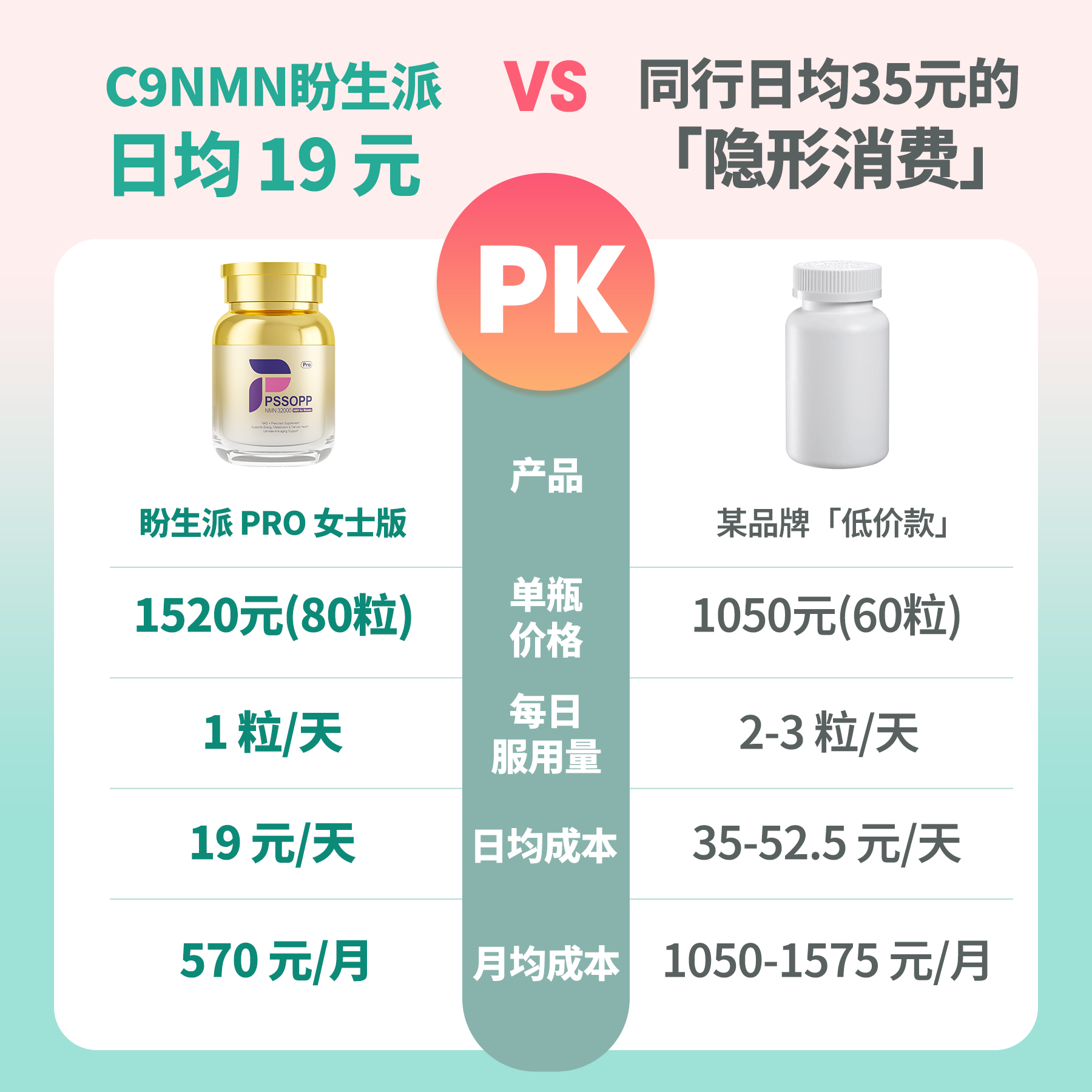 算账时间:按3个月抗衰周期算,C9NMN盼生派仅需1520元,某品牌需3150-4725元,直接省下一台高端护肤品的钱!