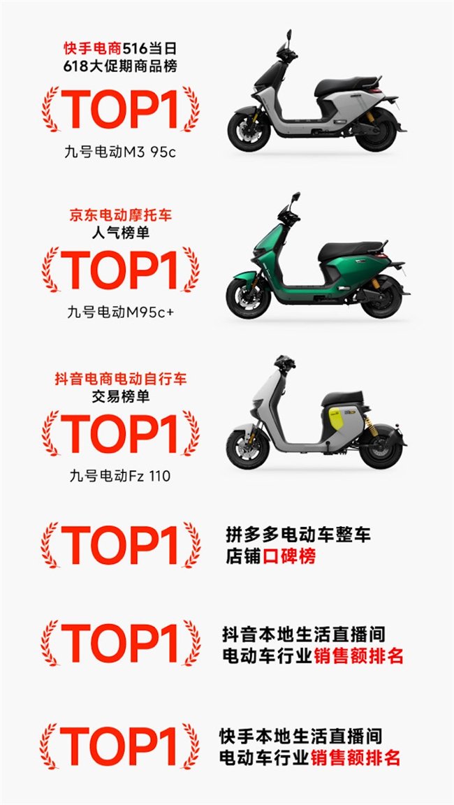而支撑这一成绩的核心,在于产品力的深度爆发。九号以“真智能”技术体系为根基,打破传统二轮车的同质化僵局,构建起覆盖不同人群与场景的爆款矩阵。主打超长续航的Fz 110系列,在抖音电动车销量榜单中高居TOP1,以真实不虚标的“真续航”赢得市场口碑;拥有行业领先的性能配置和超强性能表现的M95c+,成为京东电动摩托车品类中的现象级爆品;全面升级后智能功能更丰富整体更全面的M3 95c,则在5月16日当天中夺得快手电商销售榜榜首。