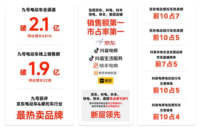 在京东平台,九号斩获“电动车&摩托车最热卖品牌”称号,稳坐品类销量与市占双榜首;在抖音本地生活领域,其市占率一举突破80%,形成断层式领先;快手平台的表现同样抢眼,市占率超过50%。这场多维度、高效率的渠道布局,不仅是品牌势能的集中释放,更是对全平台资源调动与消费者需求响应能力的集体检阅。