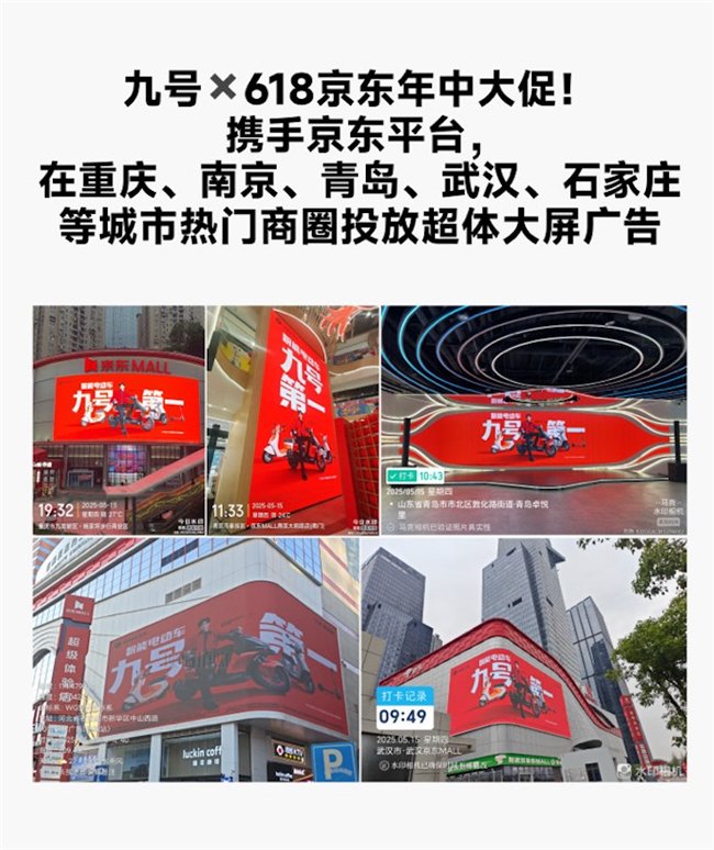 更值得关注的是,九号正在以“线上引爆+线下沉浸+本地交付”三位一体的模式,重塑智能出行的消费生态。在线上,九号联合京东,在重庆、南京、青岛等城市打造超体大屏,形成辐射全国的视觉级品牌阵列,用数字内容与场景化传播,强化品牌感知;在线下,全国超3000家门店同步升级体验区,将智能化配置从产品参数转化为真实可感的使用体验;这一切正在构建起一个覆盖需求、购买、交付、服务的无缝闭环,让“想买、放心买、即刻用”成为现实。