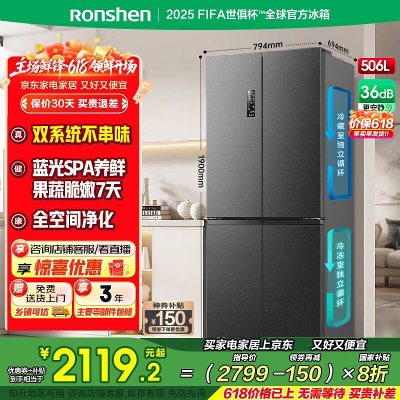 容声506L风冷十字冰箱 星蕴灰 1985元到手
