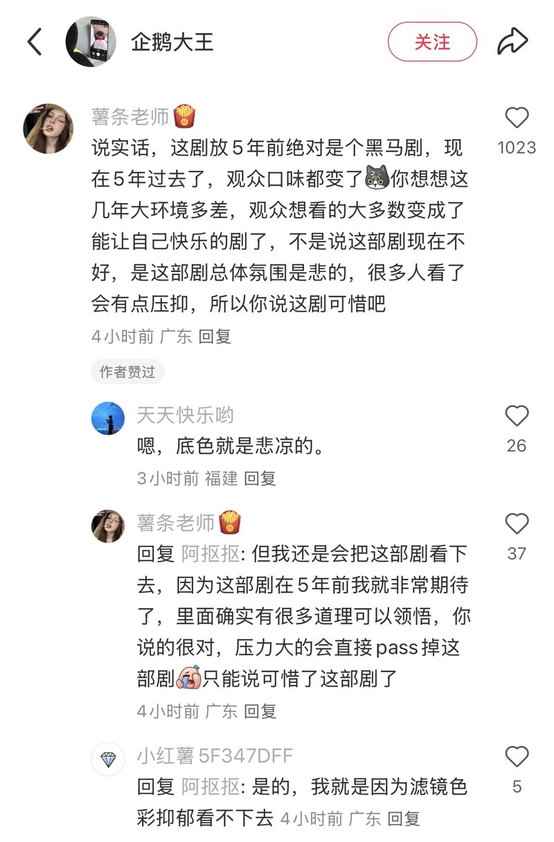 观众的喜好也确实在发生变化。比如《人生若如初见》一手好牌打到如此惨淡的局面,只能说是时运不济。剧的配置和质量都没有问题,但文娱消费环境变了、观众口味变了,五年前甚至三年前观众还有更多耐心去看严肃题材,而现在小红书上甚至有观众直接表示“我知道剧很好,但我就是看不下去,我这种山猪大概就吃不了这种细糠”。大家在巨大的生活压力之下,对娱乐产品的需求更偏向于逃离和治愈现实,连BE(bad ending悲剧结局)、OE(open ending开放式结局)都会被骂,不爽、不甜、不能带来轻松快乐的剧,更是很难进入市场主流。