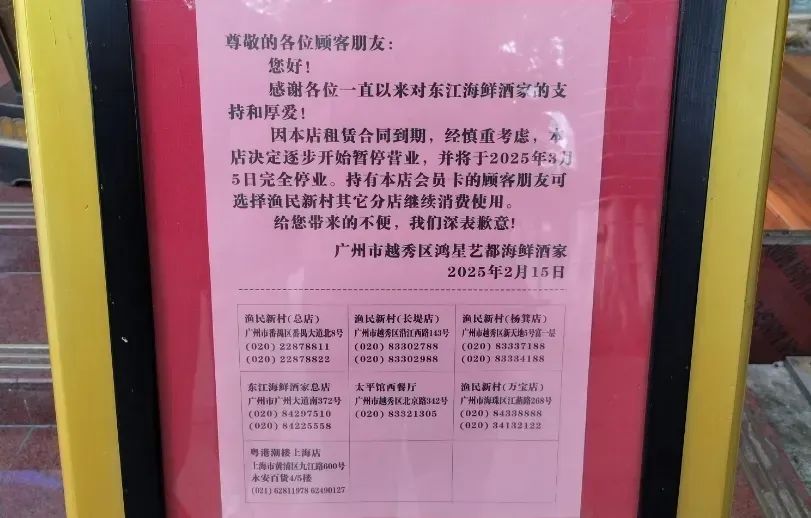 同样在2月,位于越秀区侨光路的鸿星艺都海鲜酒家也贴出告示,称门店将于2025年3月5日完全停业。至此,这家开业于1996年、陪伴广州人走过29个春秋的海鲜酒楼,也成为了历史。