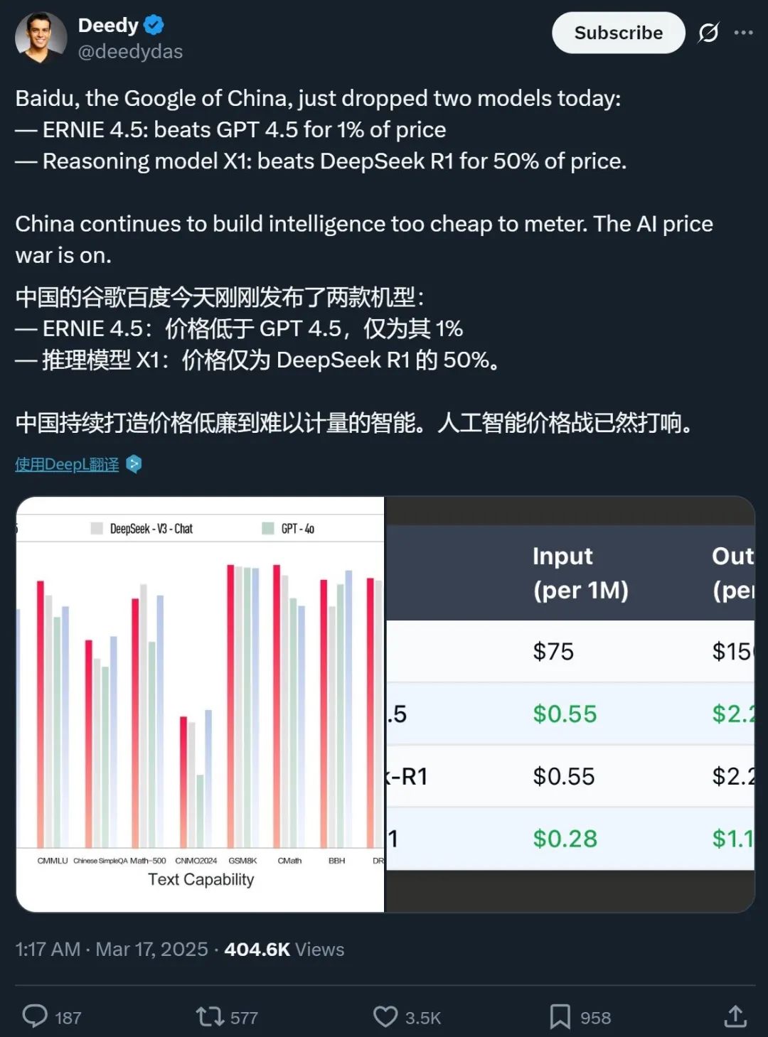 除了推理能力,文心 X1 Turbo 和之前的文心 X1 之所以出圈,和它们的成本优势也密不可分。在能力相当的情况下,文心 X1 把价格打到了 DeepSeek R1 的一半;X1 Turbo 则更进一步,把价格打到了 DeepSeek-R1 的 25%,这让一些海外开发者羡慕不已。