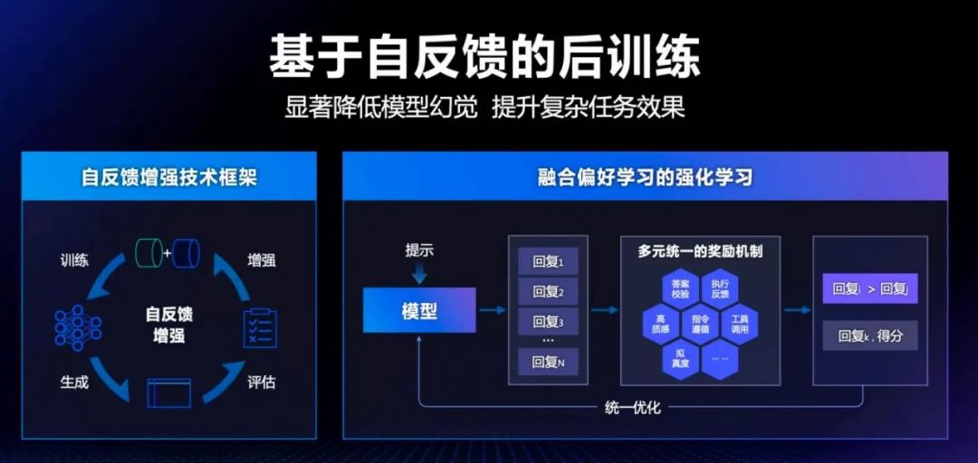 这些解决方案的出现也是技术演进的自然结果。吴甜解读到,当前基础模型的泛化能力很强,意味着模型自己可以在多任务上做探索,给模型输出结果的反馈,通过强化学习技术,让模型自行调试方向不断进化,这是让模型效果提升的重要方式。