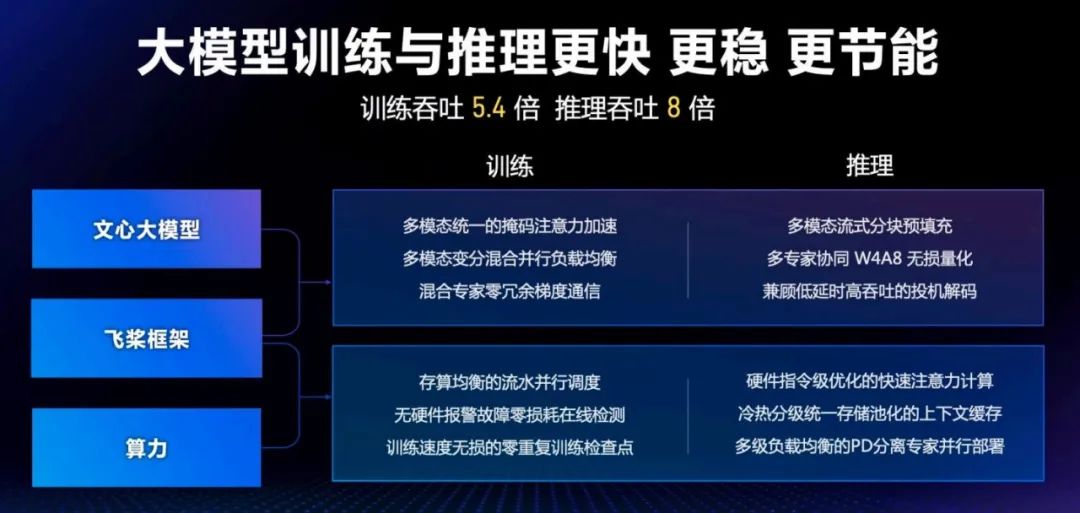 在百度 AI 的技术架构中,它扮演的是关键的「腰部」角色 —— 通过向上与模型层协同解决多模态统一和 MoE 专家均衡等问题,向下与算力层协同提升训练并行效率和推理性能,从而实现大模型的降本增效。