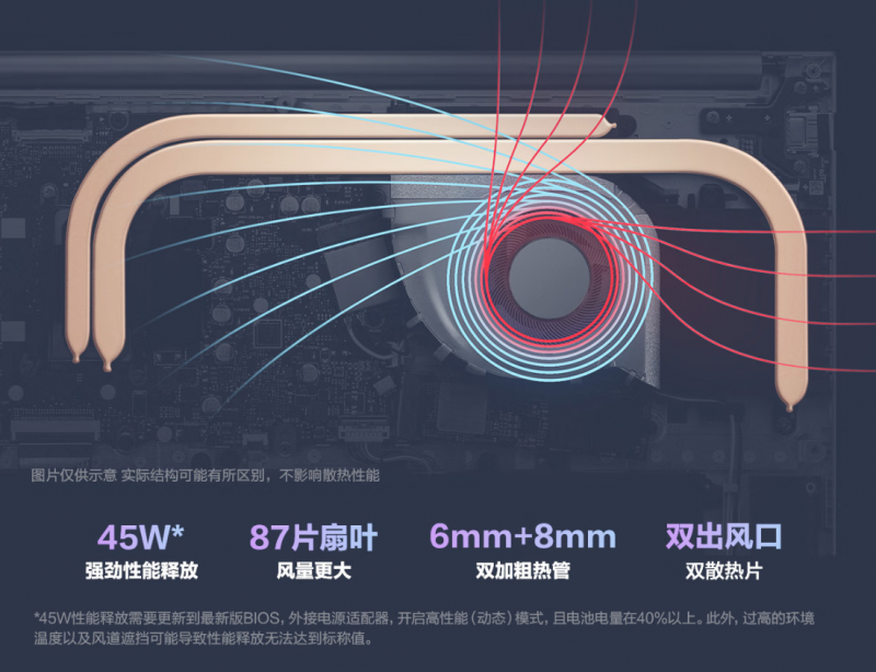 散热上采用备受好评的华硕冰锋散热系统,内部集成87片叶片大风扇,配合6+8mm加粗热管以及双出风口设计,散热效率更高,性能释放更稳定。根据使用场景不同,用户还可通过FN+F手动切换风扇模式,支持安静、标准、高效三挡调节。