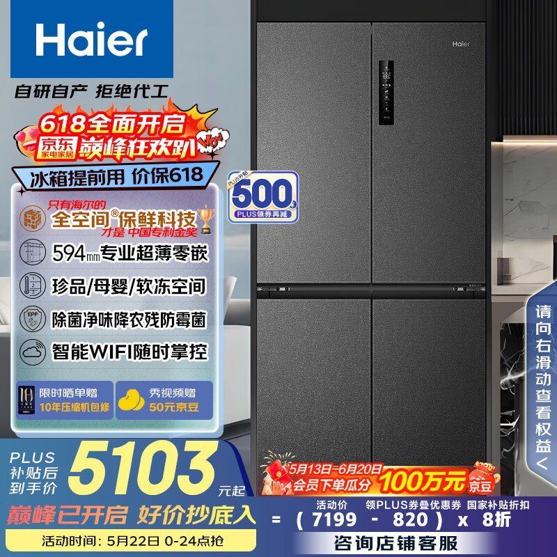 海尔零距离嵌入冰箱518L大容量节能高效