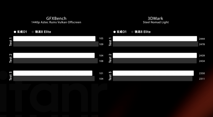 至于 GPU 方面,我们测试了 GFXBench 和 3DMark,结果是玄戒O1 和骁龙 8Elite 不相上下,来回反超。
