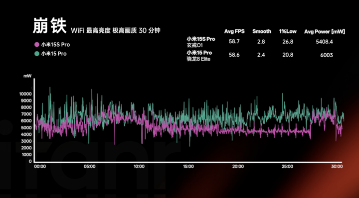 不过在 30 分钟的《崩坏三:星穹铁道》里,两部手机无论是平均帧率、稳帧指数还是 1% 最低帧都几乎是一样的,玄戒O1 的功耗还比 8Elite 要低出 0.6 W,这么看表现又可以说是很出色了。