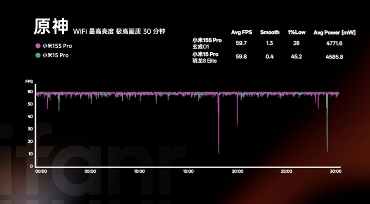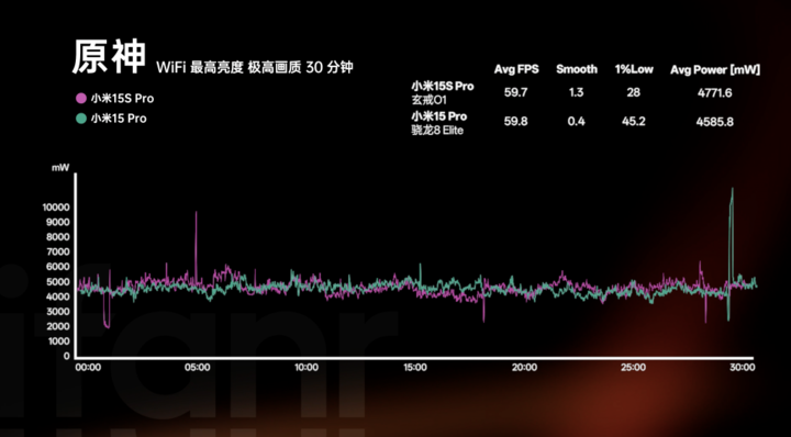 最后是负载较重的游戏场景。在 30 分钟《原神》测试里两部手机的平均帧率没啥区别,但玄戒O1 的1% 最低帧要明显低于骁龙8Elite,数据上看卡顿更明显,而且平均功耗也比骁龙 8Elite 高0.2W,整体表现是不如 8Elite 的。