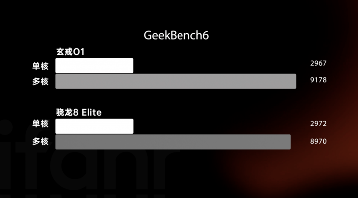 先来看看跑分。GeekBench 6 方面,双方在单核成绩打得有来有回,但多核玄戒O1 直接甩出了 200 分差距。