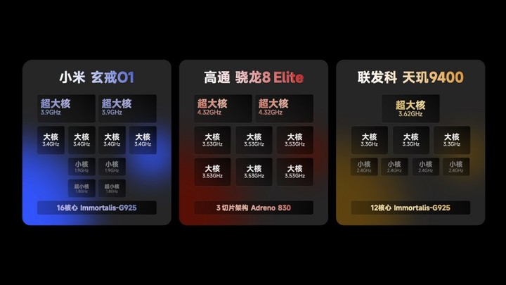 玄戒O1 采用台积电第二代 3nm 工艺(N3E),除了外挂的 5G 基带芯片来自联发科,CPU、GPU 都是小米自己拿 ARM 公版做的,双超大核的 10 核 CPU,GPU 竟然堆了 16 核心,比天玑9400 还多 4 个核。