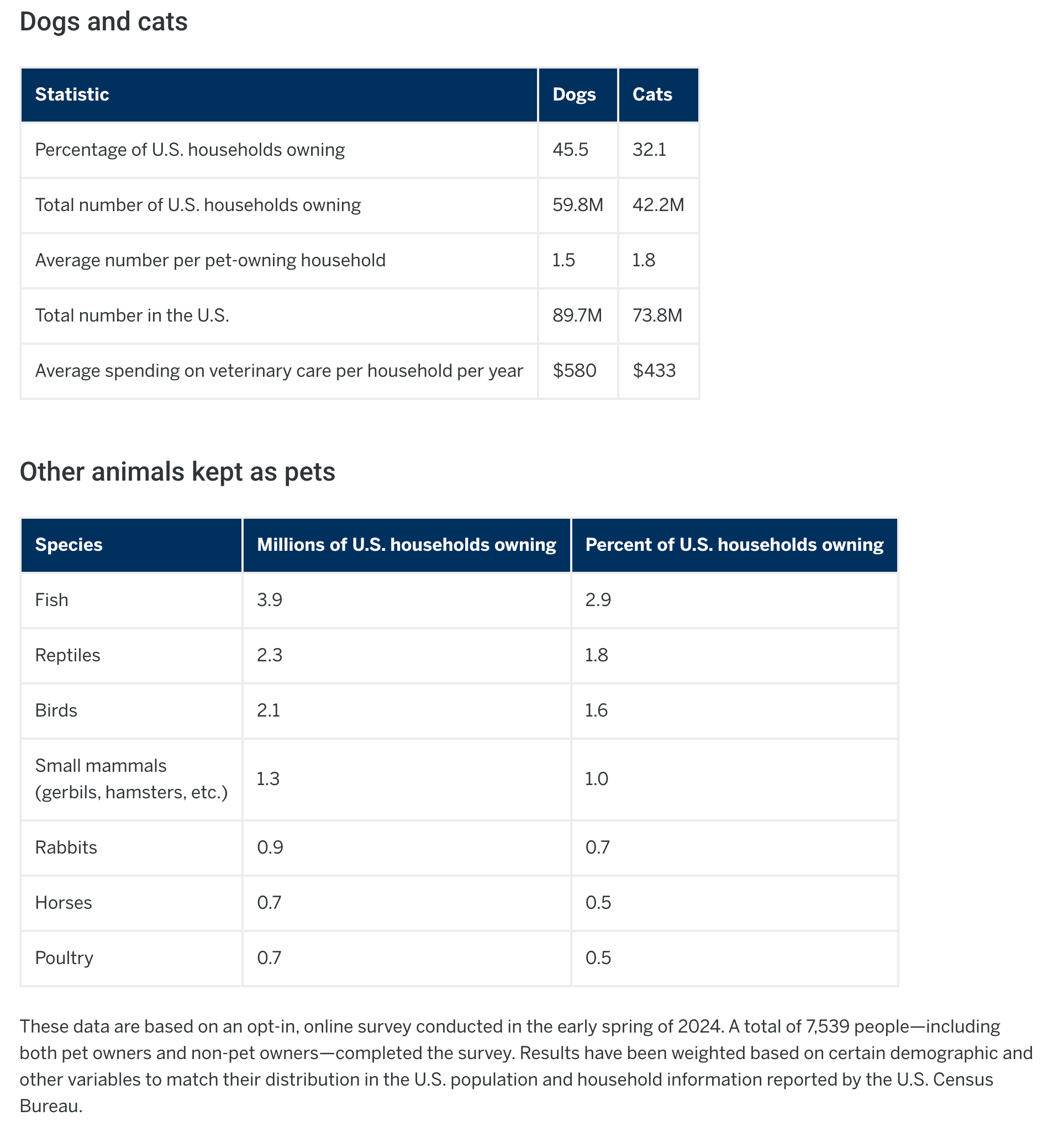 从社会和经济角度看,宠物拥有率的提升推动了宠物食品、用品及医疗服务的需求增长,同时反映了美国社会对宠物作为家庭成员的认同度日益加深。特别是在后疫情时代,宠物在情感支持方面的作用愈发显著,可能进一步刺激了宠物市场的扩张。