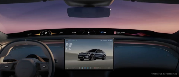 和阿维塔上面那条贯穿式的屏幕不同,小米通过投影技术,在前风挡下方形成了一道横贯仪表台的一体式环绕信息光带,长达 1.1 米。