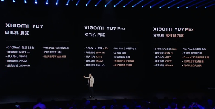 YU7 一共有三个版本:单电机后驱的标准版、双电机四驱的 Pro 版,还有双电机四驱的 Max 版。