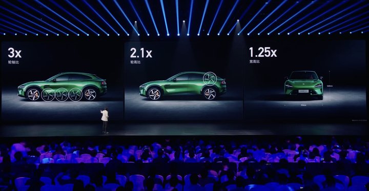 他表示,YU7 的好看来自于 3 倍的轮轴比、2.1 倍的轮高比,还有 1.25 倍的宽高比。
