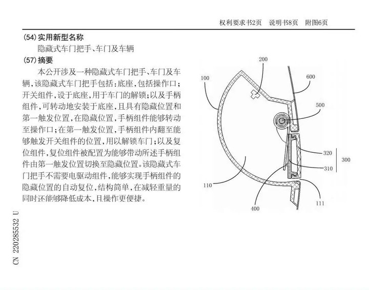 这是小米汽车在 2023 年 6 月专门为隐藏式门把手申请的专利图。从专利图看,该门把手实际上是一个独立的「内翻式」机械式结构。当我们伸手开车门,手触碰到门把手的时候,会带动内部的机械结构发生转动,进而触发门锁装置,车门解锁。