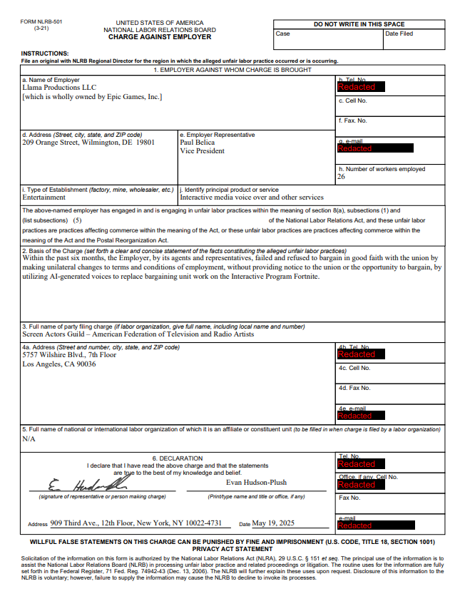 在5月18日,SAG发布公告称,已经就AI达斯·维达向国家劳工关系委员会 (NLRB)起诉了Epic子公司Llama Productions,理由因为该公司未与工会协商,就用AI替代人类配音演员,涉嫌违反集体谈判义务,属于NLRB定义的“不公平的雇佣行为”。
