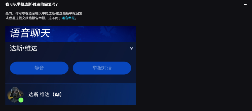 角色上线前,Epic似乎并没有公开他们在后台对AI答复设计了怎样的防备机制,但在《堡垒之夜》官网的相关FAQ里,他们表示:玩家可以举报达斯维达的回复。