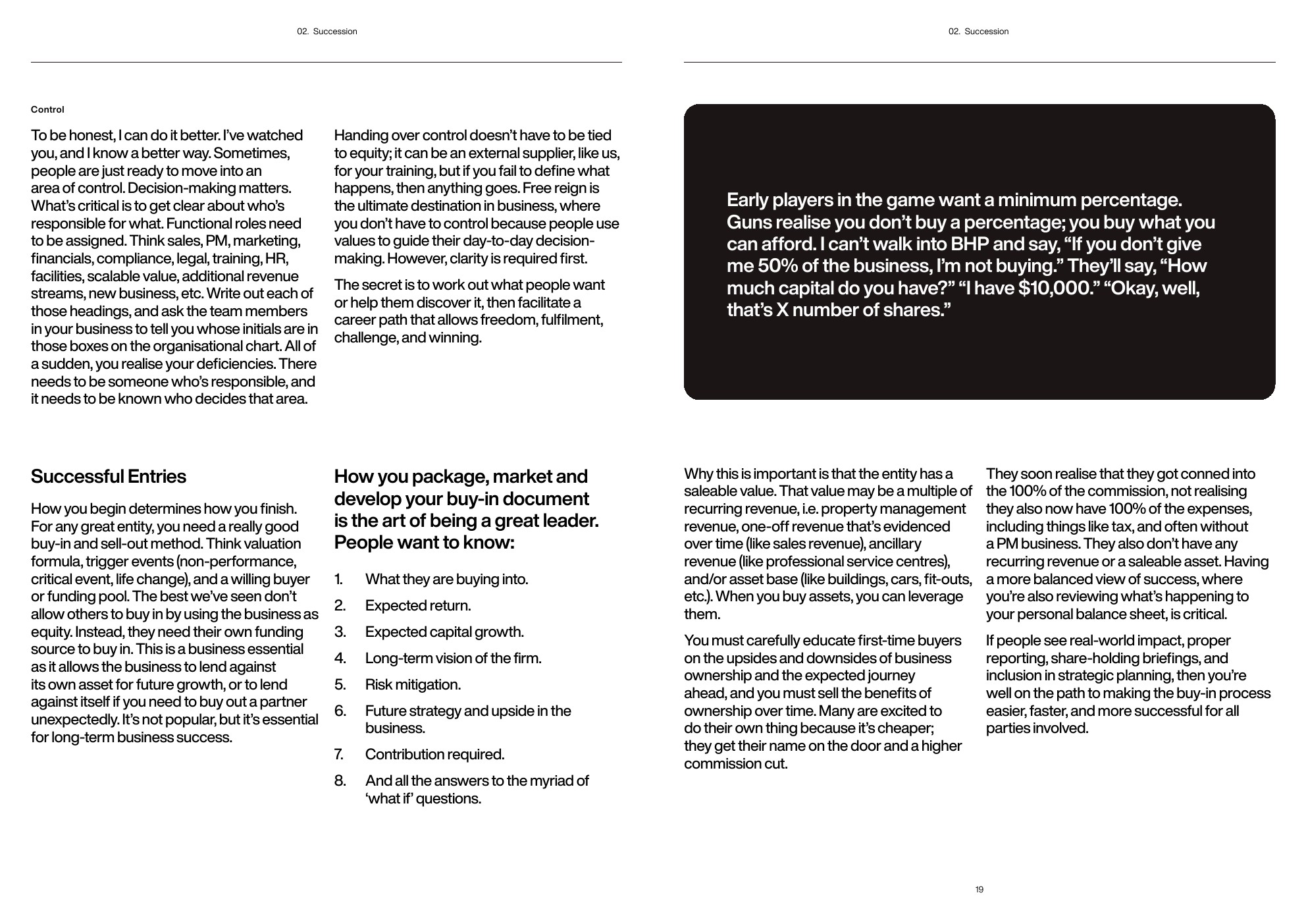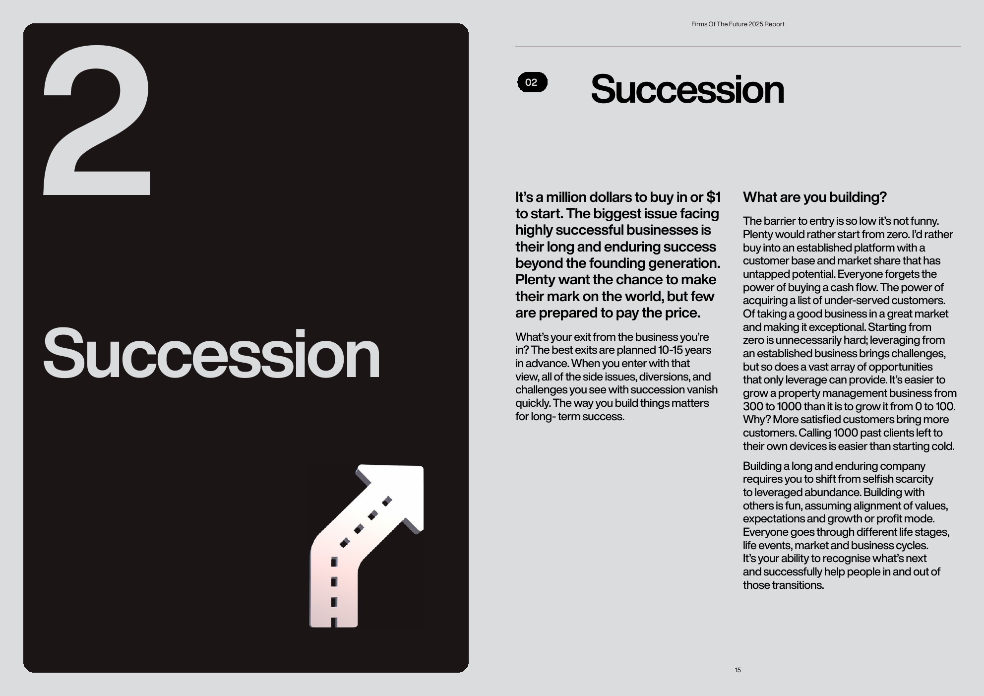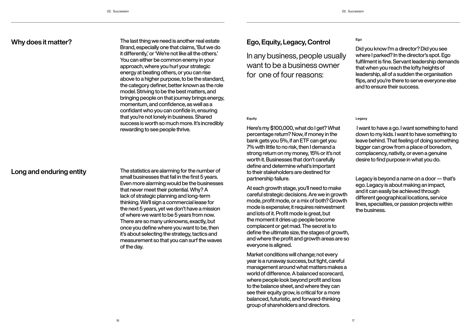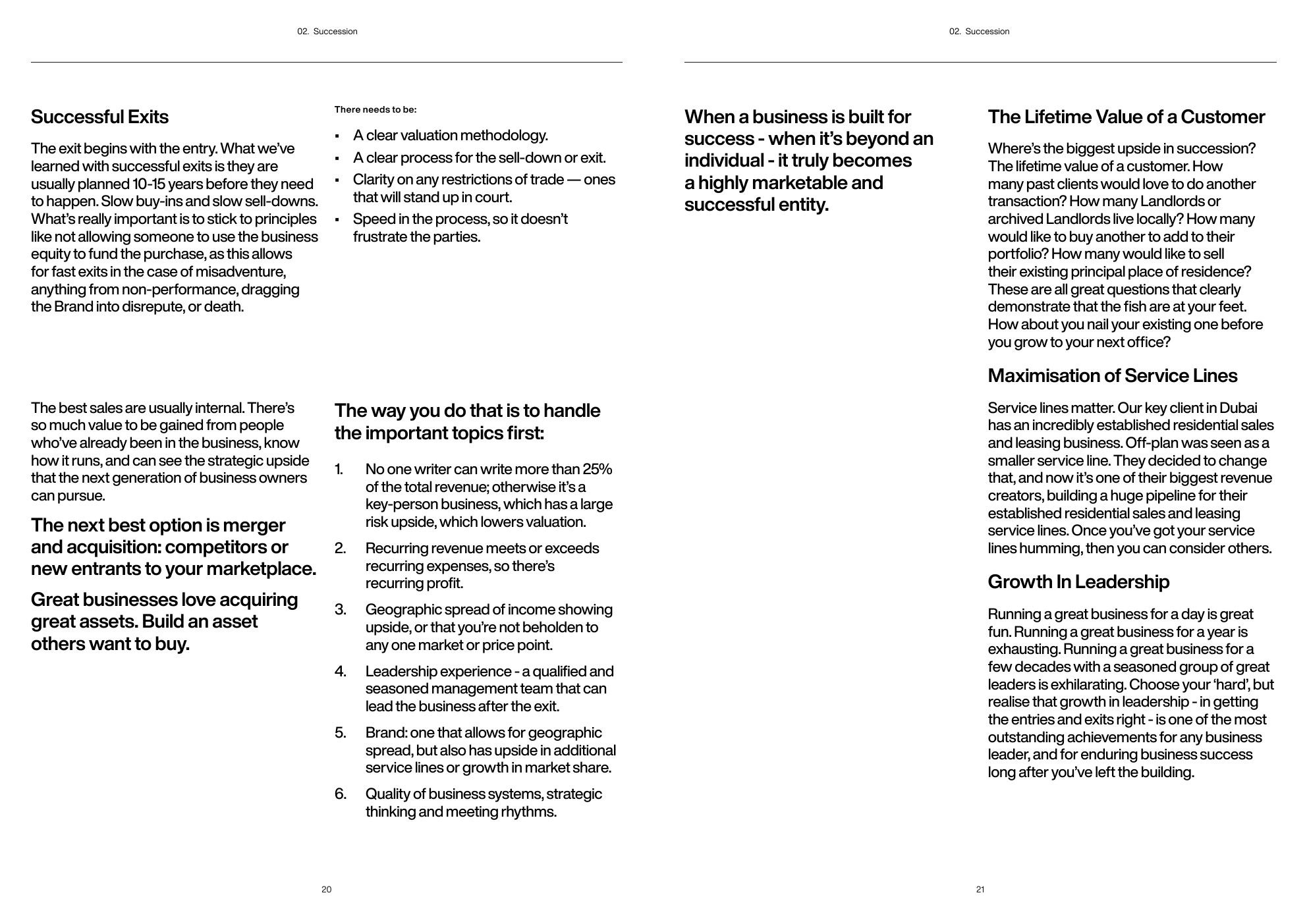 如何退出所处的业务?最好的退出计划是提前10-15年制定的。当你以这种观点进入时,所有与继任相关的次要问题、干扰和挑战都会迅速消失。构建事物的方式对长期成功至关重要。