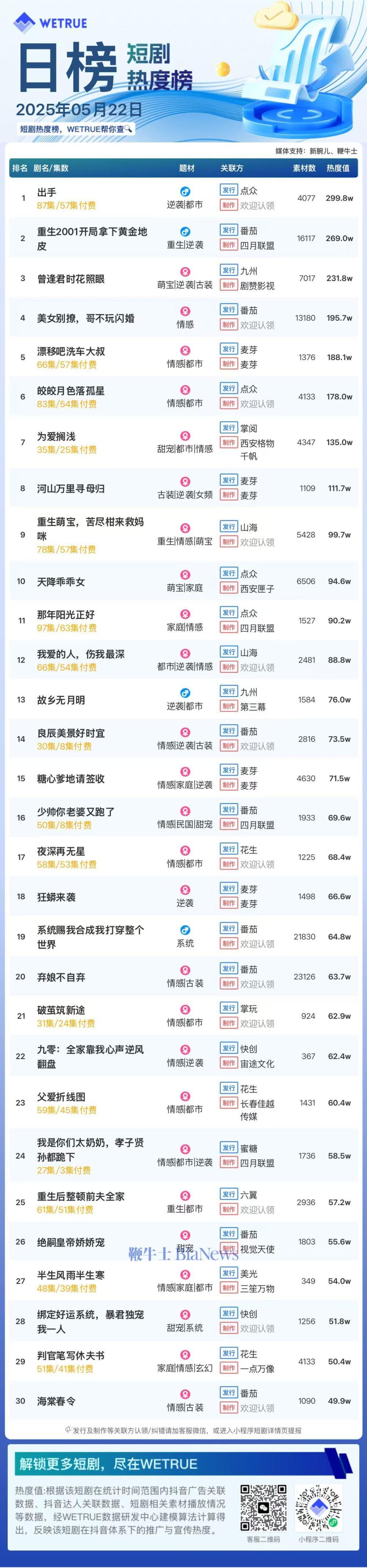 1、本日榜为WETRUE短剧数据公司提供,新腕儿和鞭牛士提供联合支持。