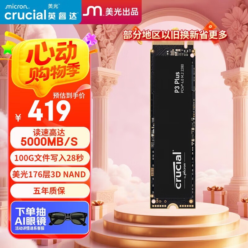 Crucial美光P3Plus 1TB固态硬盘限时特惠355元