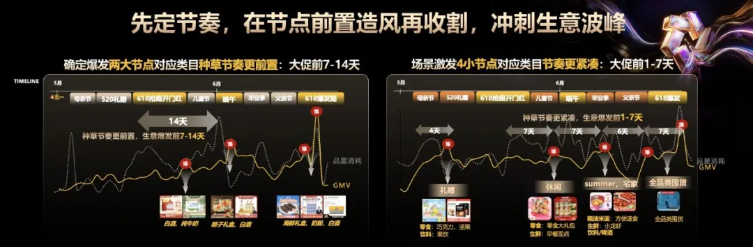 一方面,大促前7–14天,从“618抢跑开门红”开始,是品牌拉新引流、制造声量的关键期,也是内容种草和货品预热的黄金窗口。像白酒、纯牛奶、粽子礼盒、海鲜礼盒、奶粉等重点品类,往往需要提前布局,尽早出圈。能不能在这一阶段打出声量,决定了爆发期能不能接住转化高峰。