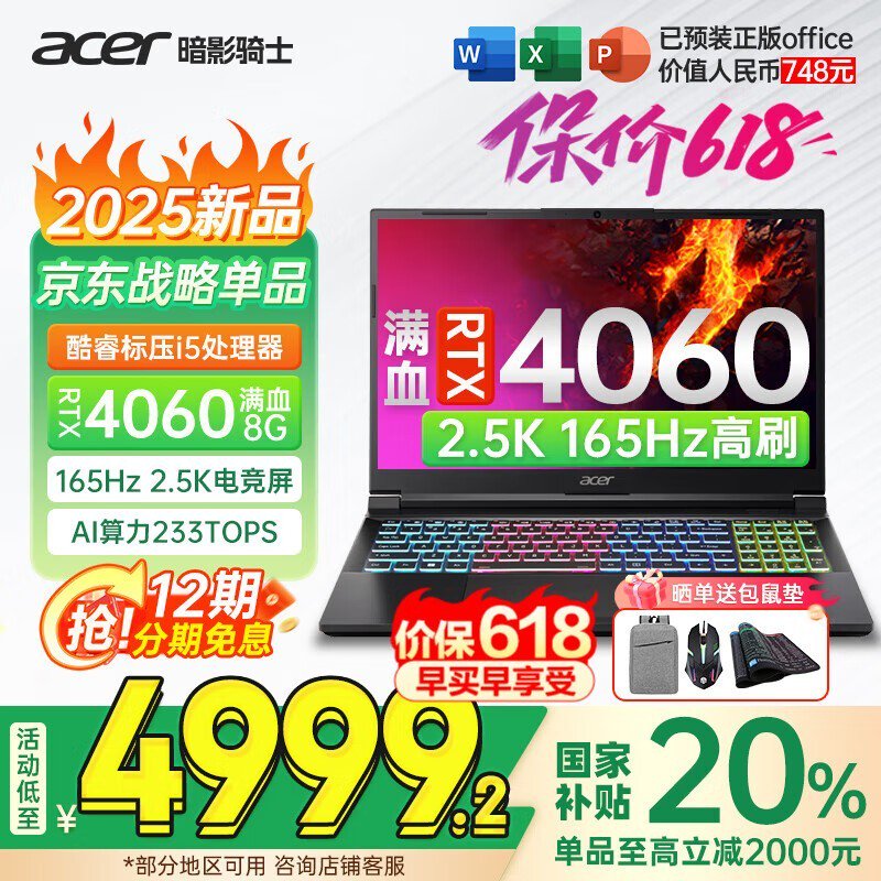 宏碁暗影骑士笔记本,i5+4060券后6249