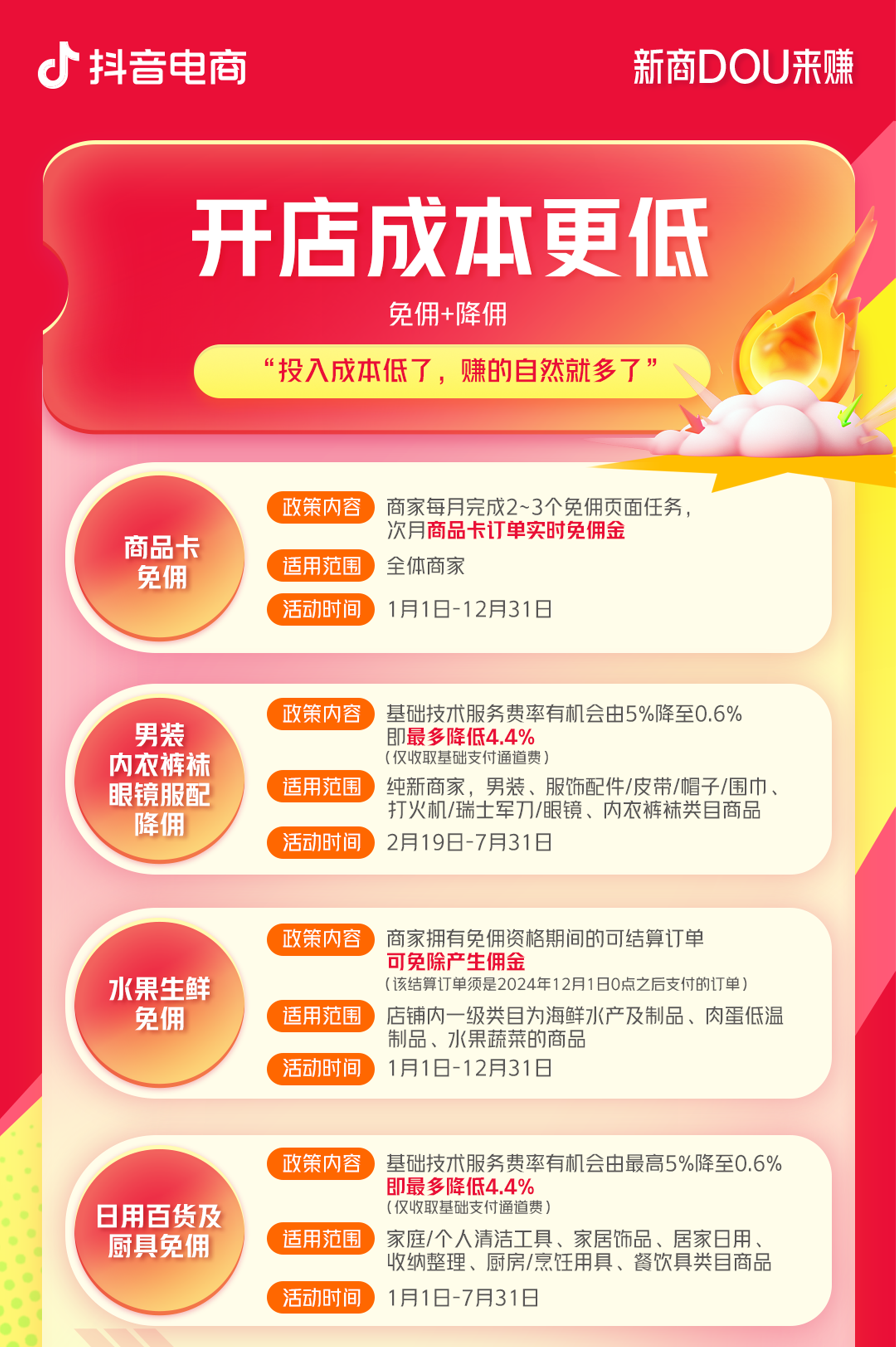 还有持续进行的商品卡免佣、水果生鲜免佣、日用百货及厨具免佣、男装/内衣裤袜/眼镜服配降佣等免佣降佣政策,帮助商家轻装上阵经营好生意。