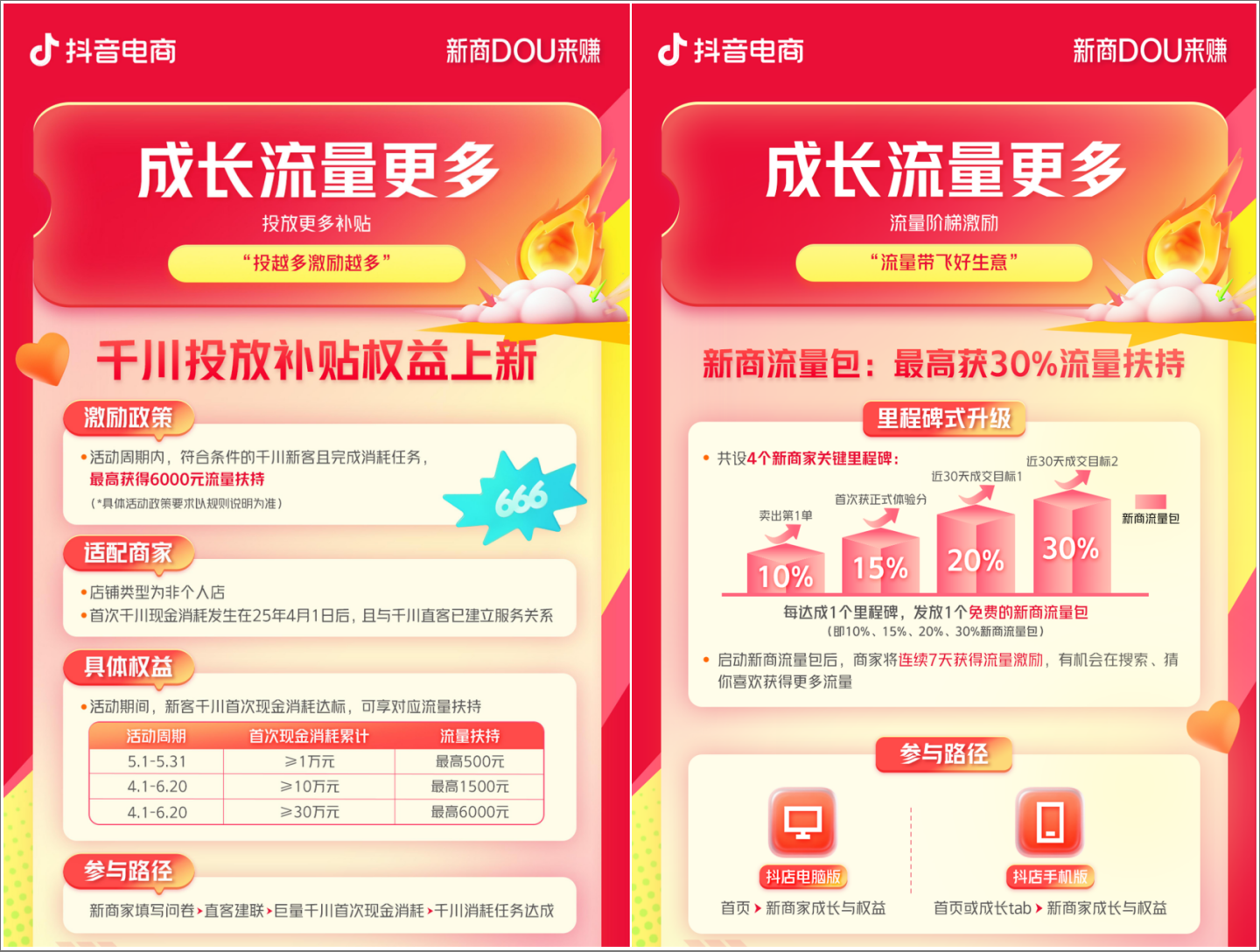 同时,为了激励新商家们的运营热情,进行高性价比的流量投放,【新商DOU来赚】全新上线了千川投放补贴权益,活动周期内完成任务,最高获得6000元流量扶持。还有能让新商阶梯式成长的新商流量包,商家可以通过完成4个关键里程碑任务,获得流量奖励,最高可获30%流量扶持。