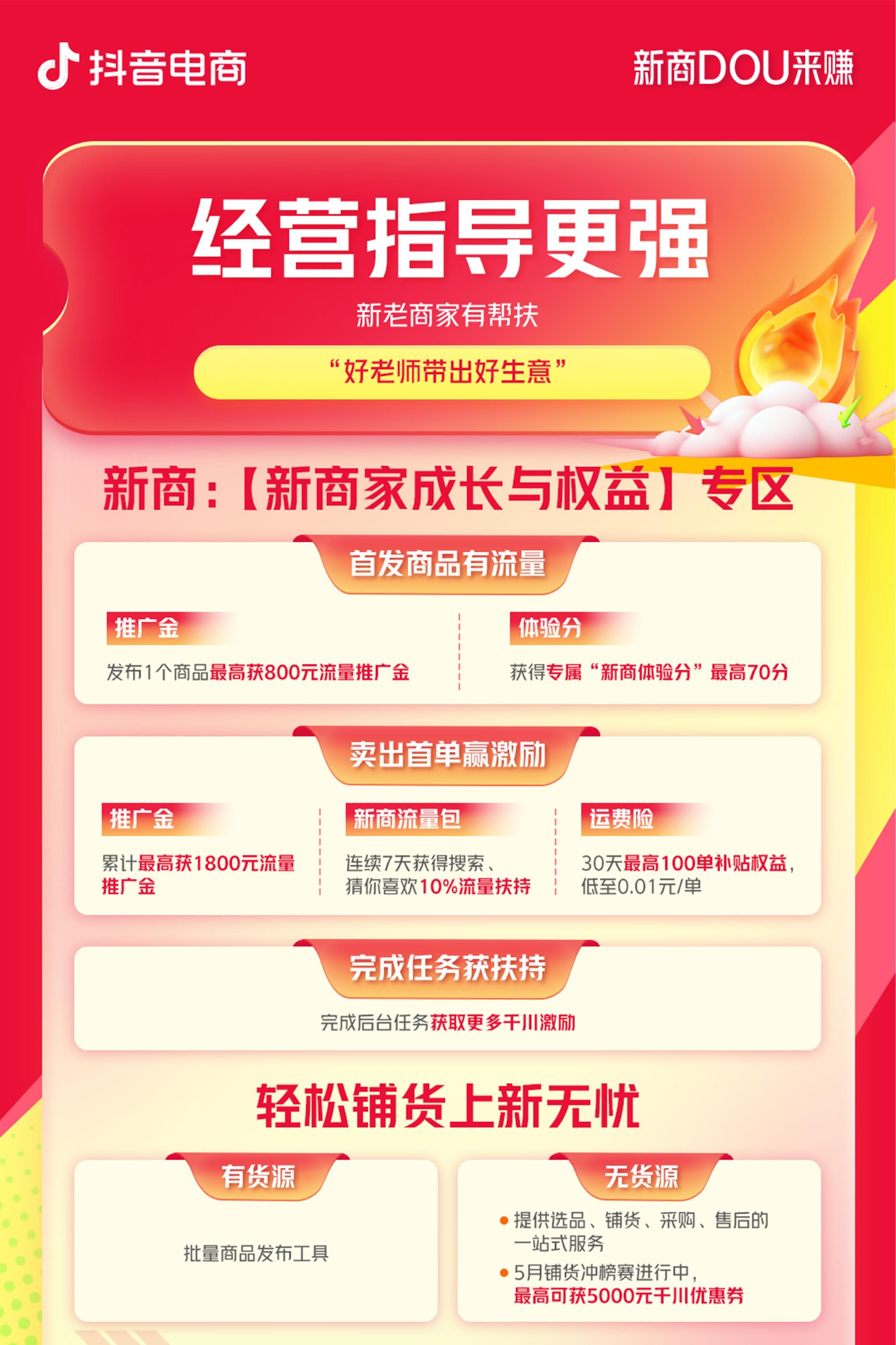 对于商家们的“开店第一步”,【新商DOU来赚】为新商们提供了翔实、清晰的成长指引。抖音电商全面升级对应政策,针对新商家设立【新商家成长与权益】专区,通过推广金流量激励、千川优惠券、专属新商体验分、首单奖励、任务成长路径等措施,帮助新入驻商家与未开单老商家发好品,出首单,快速启动店铺经营。还有帮助商家的铺货工具,为有货源和无货源的商家提供一站式服务。